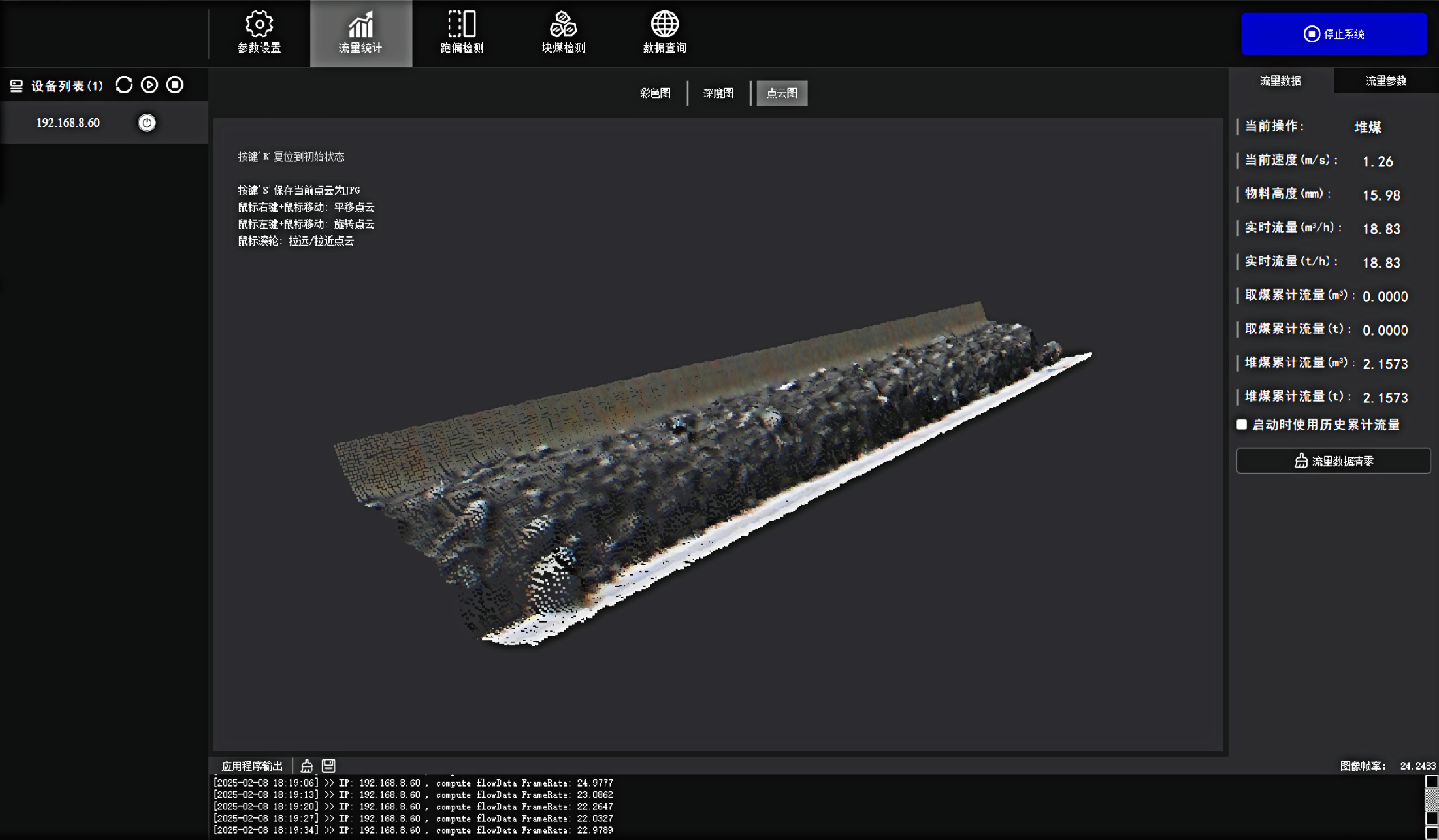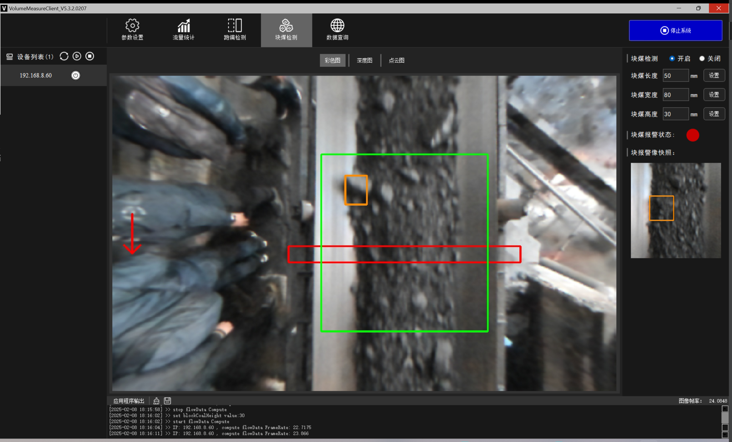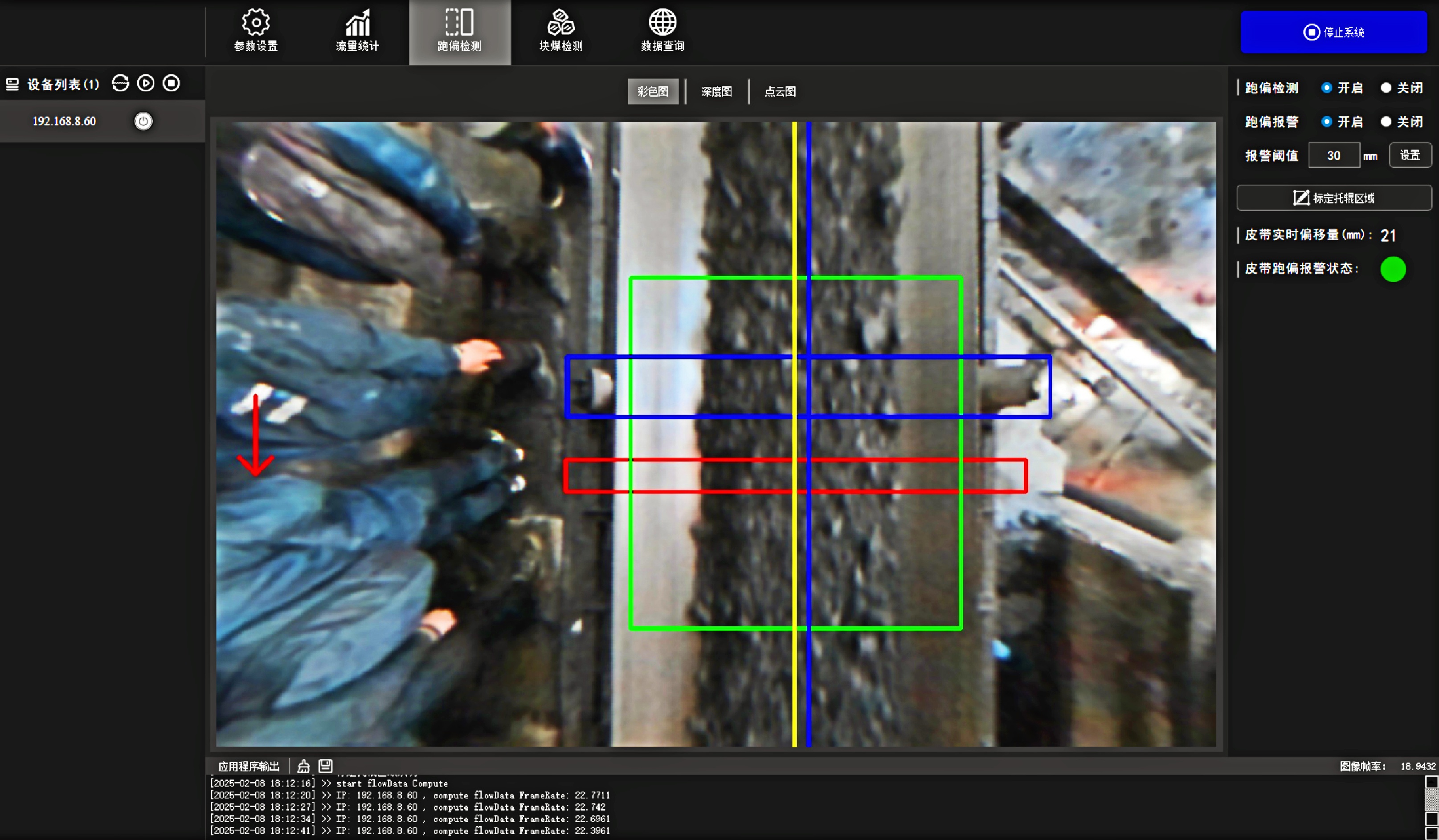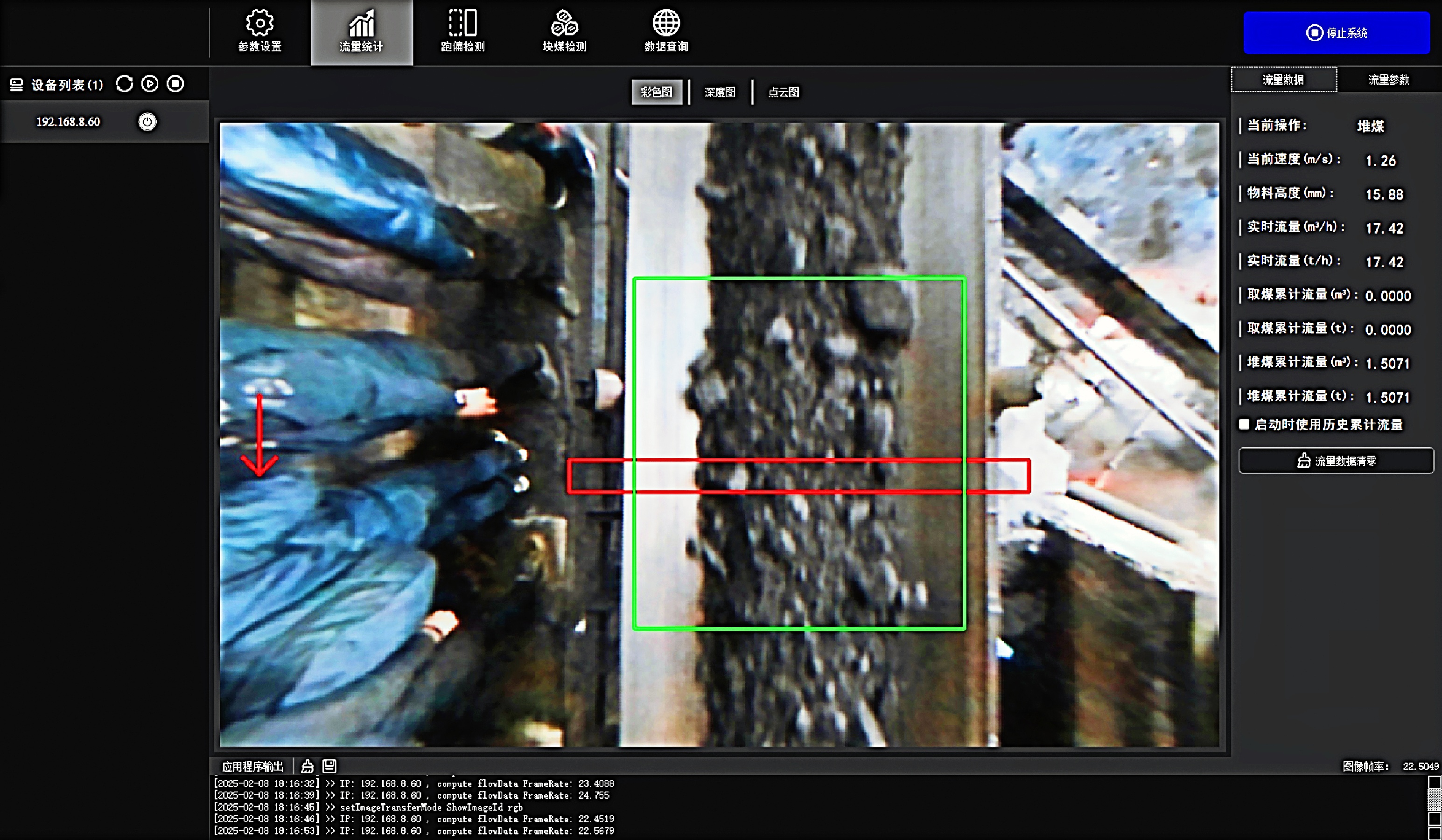 料型料流监测一体机系统 leyu.乐鱼(中国)智能®智能料型料流监测系统由智能煤流监测一体机搭配监测平台构成,实时监测输送带工业散料流量,包含煤矿、砂石骨料、粮食等 首页 产品 3D相机 leyu.乐鱼(中国)智能® 料型料流监测一体机 RBGD智能一体机 leyu.乐鱼(中国)智能® 料型料流监测一体机 系统由智能料流监测一体机搭载监测平台构成,由稳定的底层硬件、嵌入式算法软件和自动化监测管理平台实现服务,实时采集高精度煤流RGBD数据,完成场景的实时三维彩色点云重建,对高速运动的皮带输送机进行精细化管理调控→应用场景: 煤矿检测系统精细化管理 定制解决方案 应用场景 煤流统计支持皮带速度6m/s,环境适应强,部署简单,无需改造现场环境即可安装块煤检测通过三维点云数据分析,能够对块煤的尺寸进行精确测量,准确计算出块煤的长、宽、高等尺寸数据输送带自动测速自动测量高速运动中的输送带速度,确保及时发现异常波动输送带跑偏检测通过获取的输送带三维尺寸位移信息,对皮带左右边缘位置与阈值比较并判断是否偏离正常轨道,同时计算跑偏幅度和方向煤流高度检测对煤流高度精准检测,能够有效管理煤流的分布、运输量、堆积情况 产品特点 测量误差<5%在高速动态检测上,测量精度可达毫米级,测量结果与实际煤量误差小于5%工业级硬件设计采用IP65防护等级和工业级防尘防水,可在高粉尘、大温差的情况下稳定运行室内暗光环境适用在室内、地下、夜晚能稳定测量,无需补光部署简单,安装便捷,支持二次开发出厂相机内参标定,可快速部署集成,无需改变现场环境即可安装,实施速度快,调试简单,系统易于维护接口丰富,数据直传丰富的系统对接接口,可直接对接PLC、变频器、服务器,快速完成精细化皮带控制大景深、大视野,多范围应用测量皮带宽度达2.4m;煤堆高度达1.5m边缘计算架构,实时测量使用边缘计算架构,将多种智能算法在边缘端实现,保证数据实时传输 性能参数 RGBD智能一体机型号VEA020-800-X180参数技术原理主动式双目基线长度180mm测量范围0.9m~2.5mZ向精度1m:≤1.3mm帧率25fps数据类型深度图、彩色图、红外图、点云图分辨率彩色图像:1280x800/640x400 ; 深度图像:1280x800/640x400像素形式彩色图: 8位三通道图 ;深度图:16位单通道图彩色视场角Horizontal 90°,Vertical 64°深色视场角Horizontal 90°,Vertical 64°RGBD同步对齐支持曝光类型全局曝光曝光控制自动/手动流量统计技术参数推荐安装高度1.2m~1.5m覆盖输送带范围0~3m支持输送带速度0~6m/s,推荐0~4m/s流量统计精度误差<5%物料高度测量支持,精度毫米级自动测速支持,安装位置需要具备照明条件实时流量统计 支持,统计周期支持配置跑偏检测支持,跑偏精度可达毫米级块煤检测 支持,支持块煤参数定义数据存储支持5年以上体积结果化数据存储数据查询支持按小时,天和月等维度查询实时视频支持rtsp协议彩色图像拉流点云数据支持彩色点云拼接数据输出协议支持TCP硬件参数数据传输接口千兆以太网相机供电要求12V~24V DC功耗18w结构尺寸(mm)270mm x 80mm x 44mm重量(g)1200g防护等级IP65温度工作温度:-25 ~50°C ;存储温度:-30 ~80°C湿度20% ~ 85%散热方式被动散热软件支持开发环境Windows/Linux数据协议TCP数据查看流量统计客户端 点云图 资料下载 leyu.乐鱼(中国)智能® 煤流体积测量输送带监测管理平台 产品资料下载 请填写此表格并点击提交后,程序会自动下载文件 *合作意向 请选择 商务合作 媒体合作 投资者合作 *电话 *姓名 公司 行业 职位 邮箱 地址 您的留言 提交并下载资料 您也可以拨打leyu.乐鱼体育的客服电话:010-81046658 联系leyu.乐鱼体育